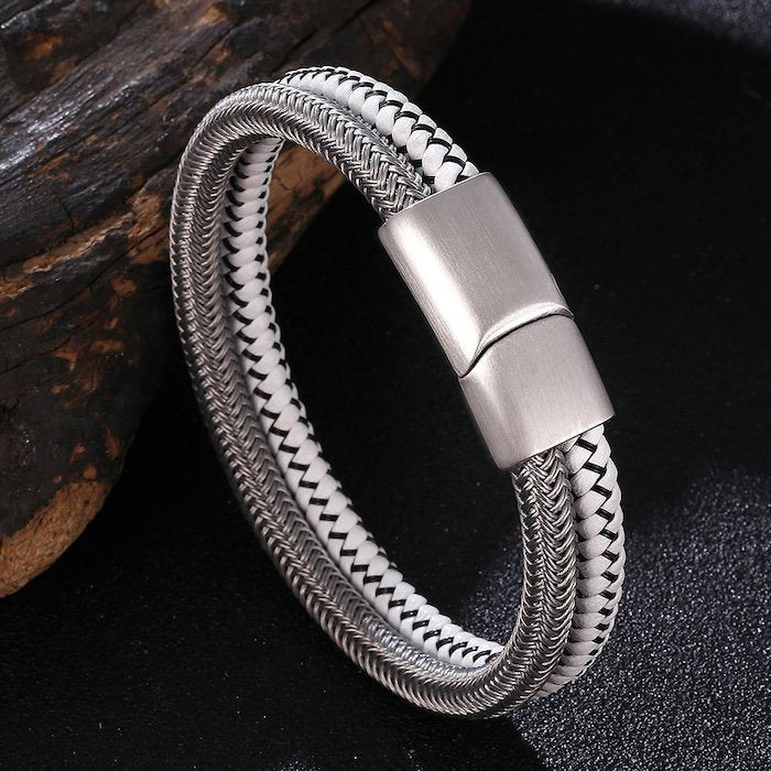 Zilver gevlochten armband-staal en wit leer