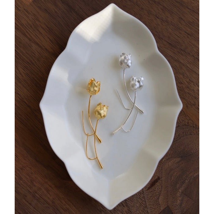 Deze oorbellen hebben een uniek langlijnsilhouet versierd met levendige tulpenbloemblaadjes. Gemaakt van messing en verkrijgbaar in goud- of verzilverde afwerkingen....