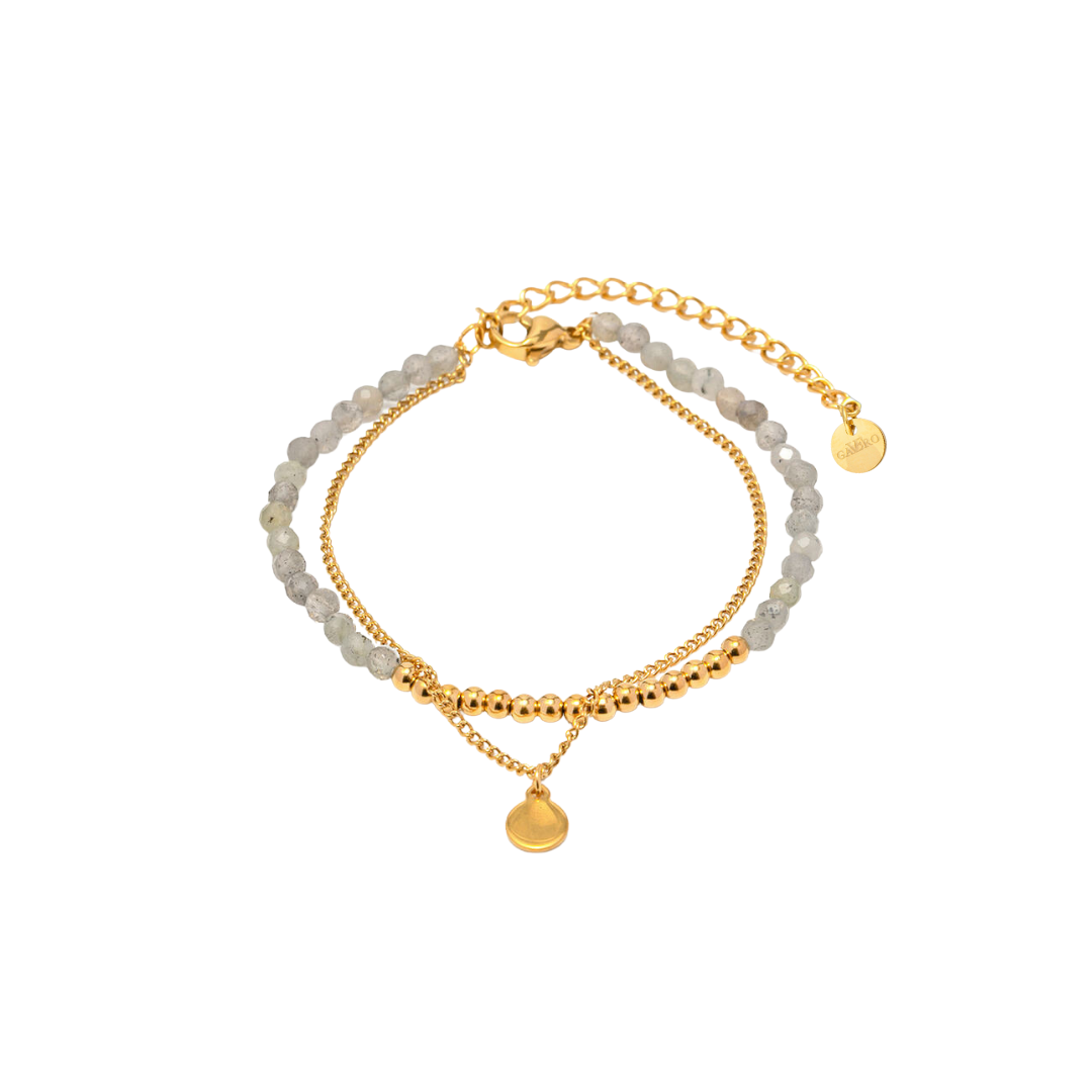 Laat je verrassen door fijne sieraden met de SERENITÀ-armband! Dit dromerige accessoire heeft twee rijen gouden kralen en grijze kristallen...