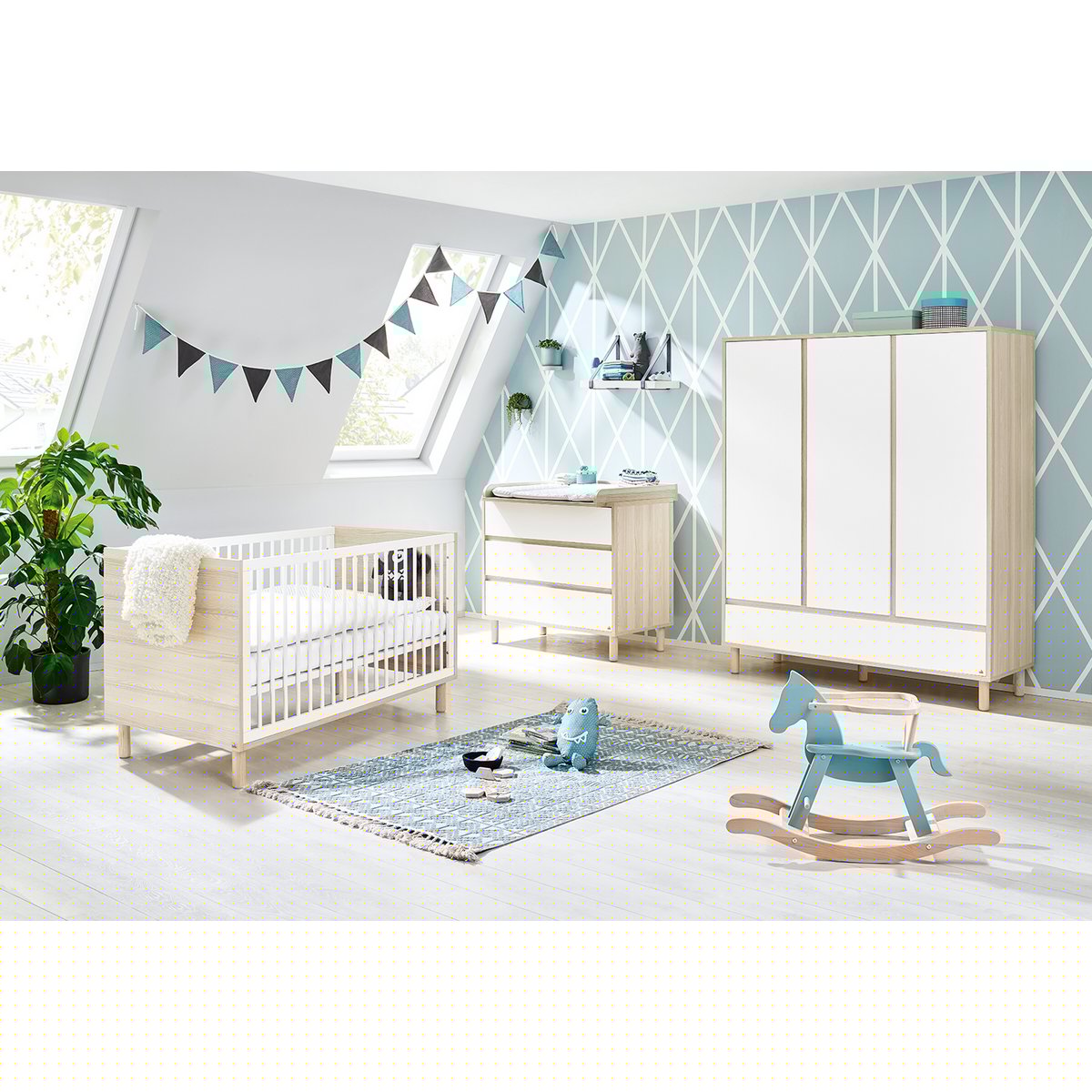 • Decor: essen met echt houtpatroon en effen, wit• 3-delige set met ledikant, brede commode en grote kledingkastKinderbed:• Decor: essen...