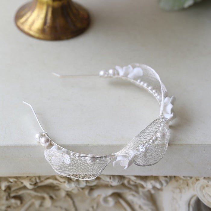 Romantische zilveren mesh bruidshoofdband-keramische bloemen