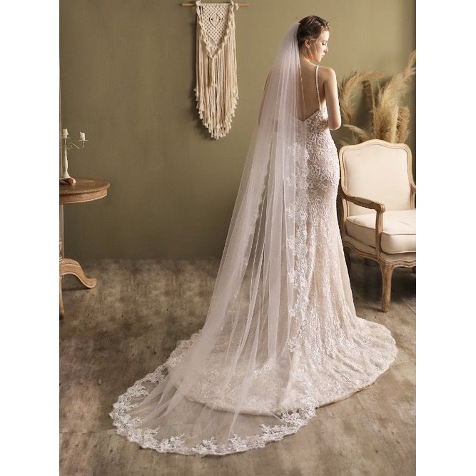 Kathedraallengte bruidssluier met kanten rand - koninklijke stijl witte bruiloft tule accessoire - strijk het voor gebruik