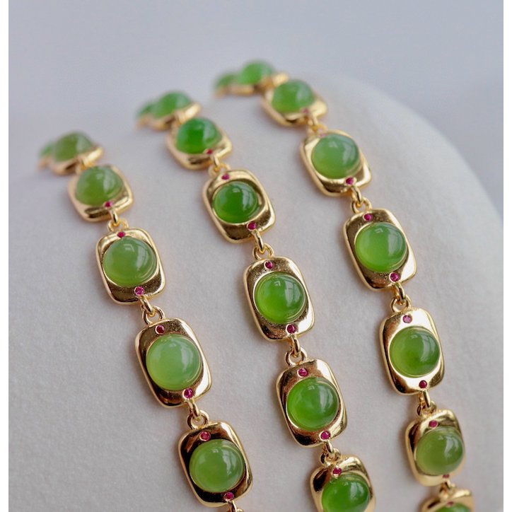 Dit prachtige stuk bestaat uit echte groene jade uit Rusland, waarbij elke steen is ingelijst in goudvermeil en geaccentueerd met...