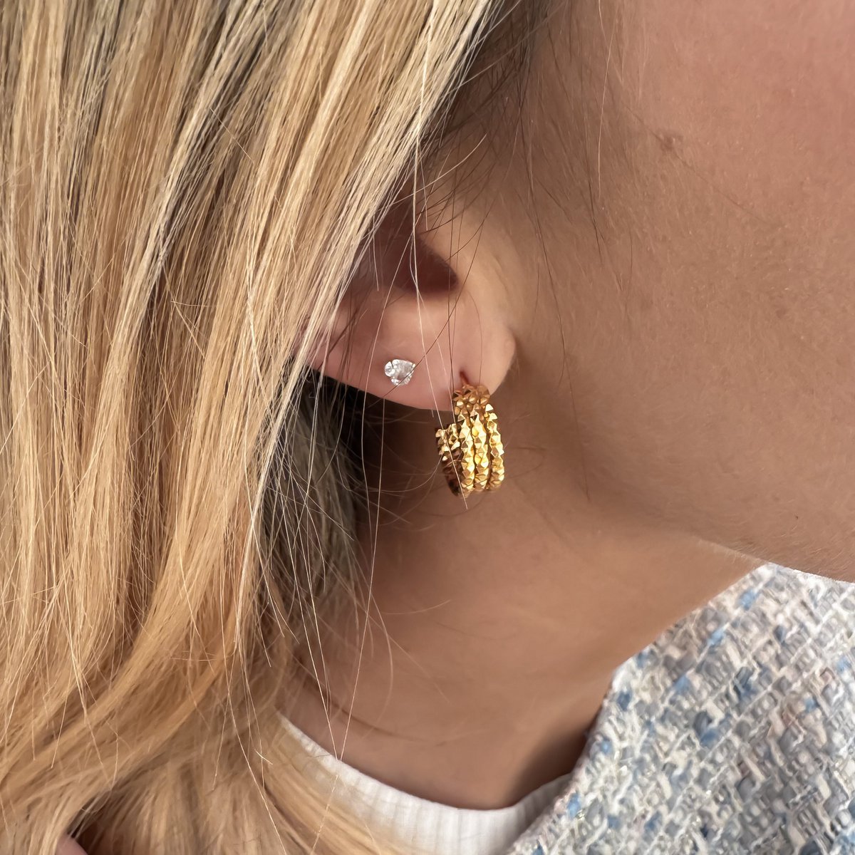 Breng pit in je look met SOLARE oorringen! Deze lichtgewicht oorringen zijn niet alleen comfortabel om te dragen, maar hebben ook een unieke structuur. Een echte eyecatcher voor iedere gelegenheid! Materiaal: roestvrij staal, waterdicht 18K verguld. Afmetingen: 1,8 x 0,66 cm